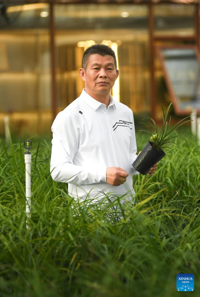 Liu Jianming is pictured at an orchid planting base in Tangdi Village of Keqiao District in Shaoxing, east China's Zhejiang Province, Feb. 19, 2024.(Xinhua/Weng Xinyang)