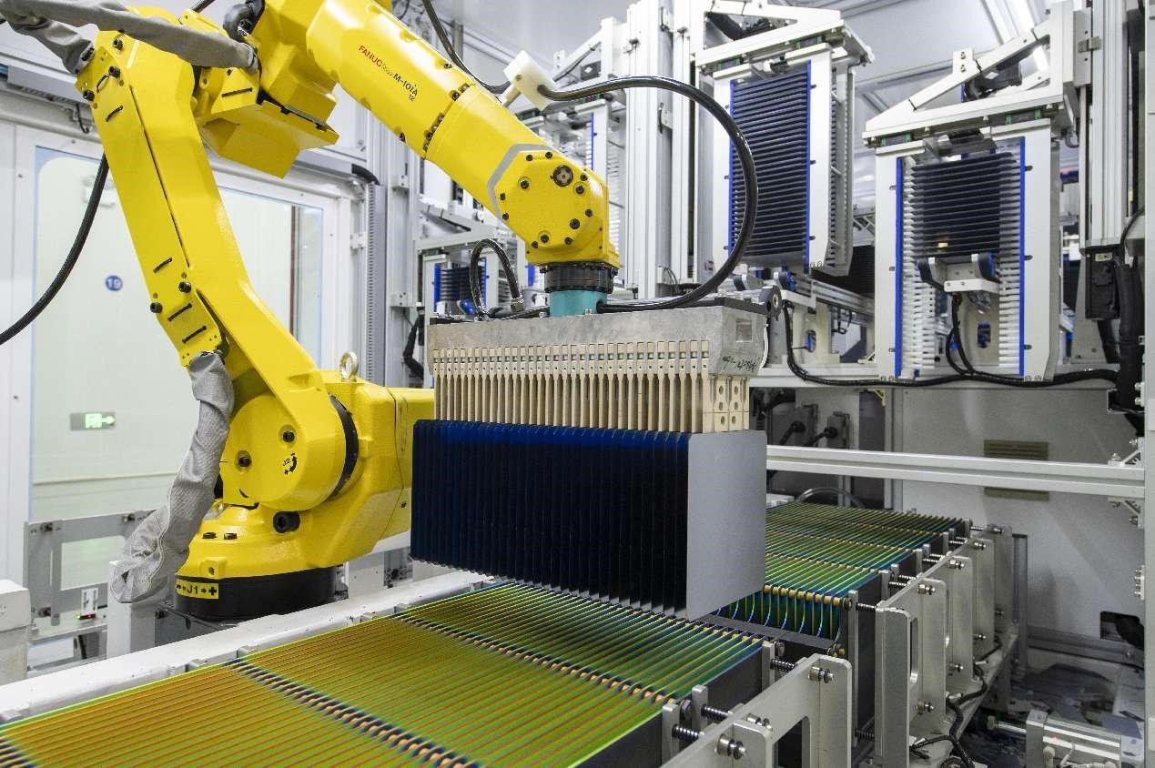 In a factory of DMEGC Solar in Hengdian, Jinhua, east China's Zhejiang province, an automated solar panel assembly machine operates on a 5G private network. (People's Daily Online/Hu Xiaofei)