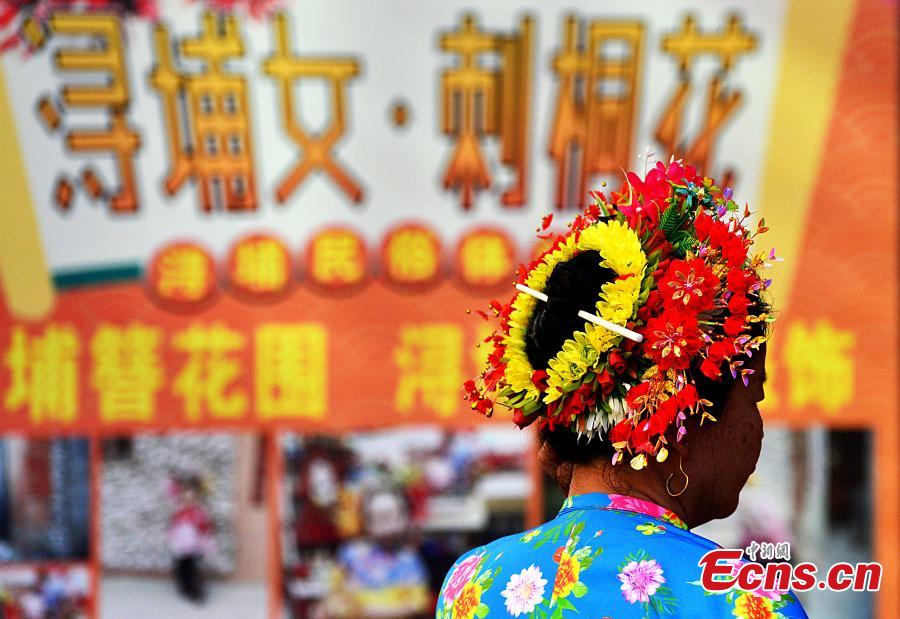 The floral headdress, a traditional symbol of Xunpu women, is called Zanhuawei in Quanzhou, a port city known as one of the starting points of the ancient maritime silk road. The flowery headwear is made of fresh flowers and hairpins and was included in the second batch of national intangible cultural heritage in 2008.