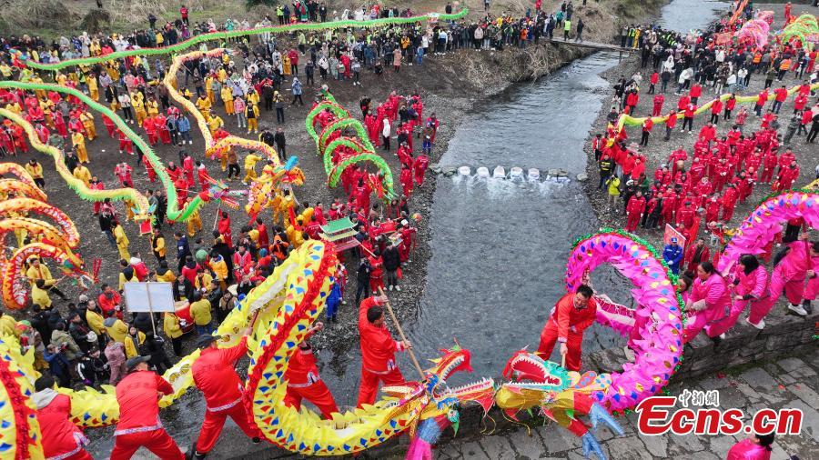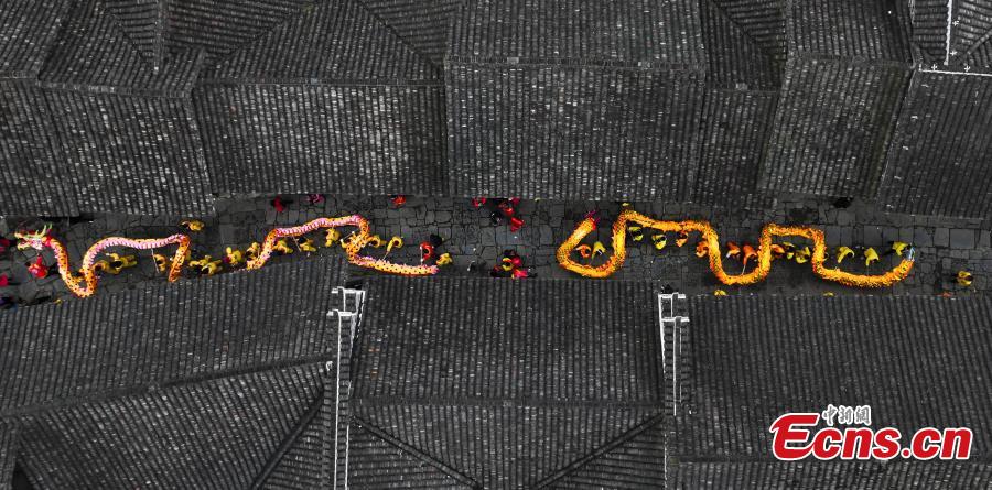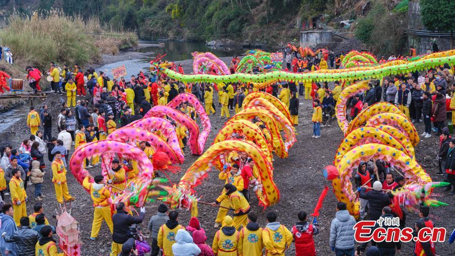 Villagers perform dragon dance to greet Lantern Festival in Zhaiying ancient town of Songtao Miao Autonomous County in Tongren, southwest China's Guizhou Province, Feb. 28, 2018. (Photo: China News Service/Yin Gang)
