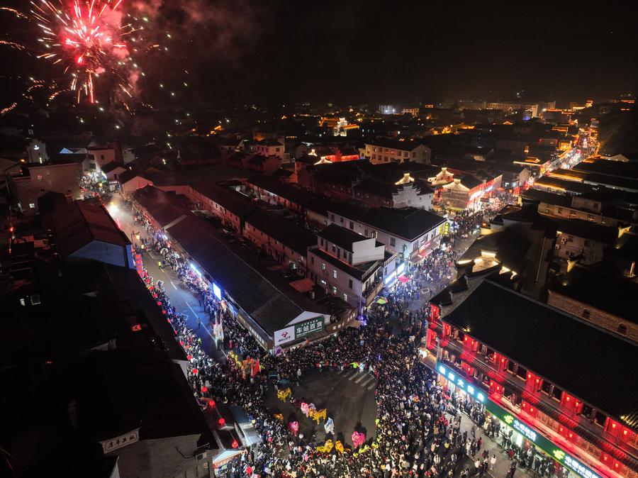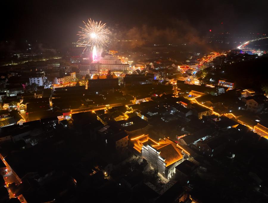 An aerial drone photo shows fireworks exploding over Qiantong Town, Ninghai County, east China's Zhejiang Province, Feb. 23, 2024. (Xinhua/Weng Xinyang)