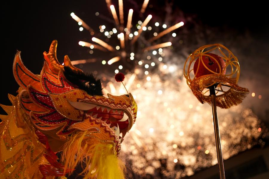 People perform dragon dance during the Qiantong Lantern Festival Parade in Qiantong Town, Ninghai County, east China's Zhejiang Province, Feb. 23, 2024. (Xinhua/Weng Xinyang)
