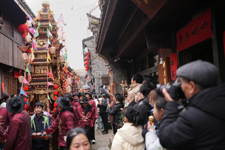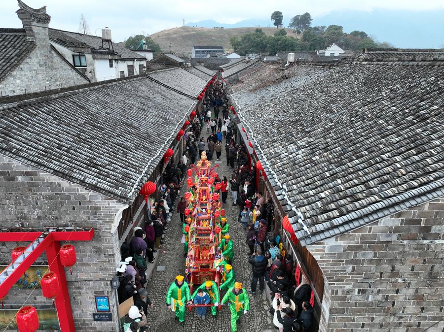 Villagers and tourists participate in the Qiantong Lantern Festival Parade in Qiantong Town, Ninghai County, east China's Zhejiang Province, Feb. 23, 2024. (Xinhua/Weng Xinyang)