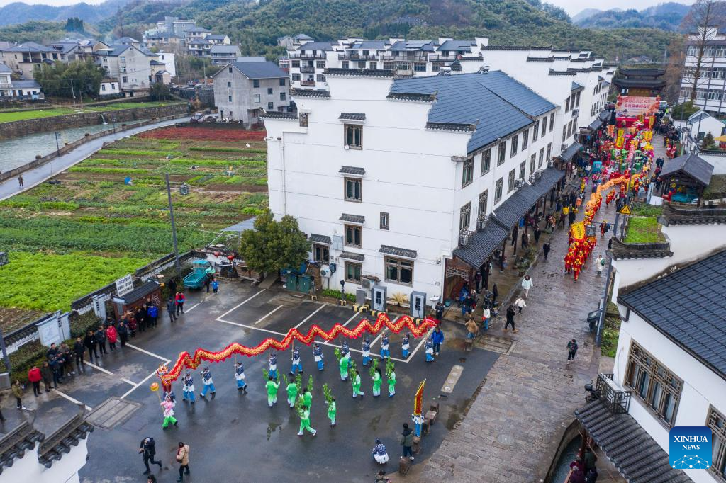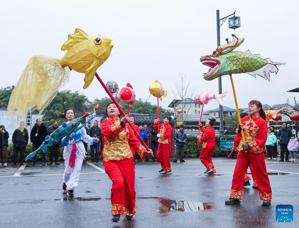 People perform during an event celebrating the upcoming Chinese Lantern Festival in Hefu Town of Huzhou City, east China's Zhejiang Province, Feb. 23, 2024. (Xinhua/Huang Zongzhi)