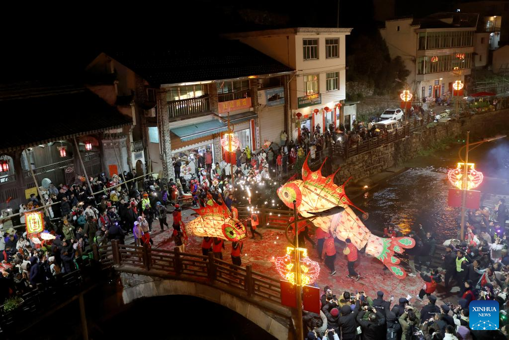 People perform dragon dance during an event celebrating the upcoming Chinese Lantern Festival in Hefu Town of Huzhou City, east China's Zhejiang Province, Feb. 23, 2024. (Xinhua/Huang Zongzhi)
