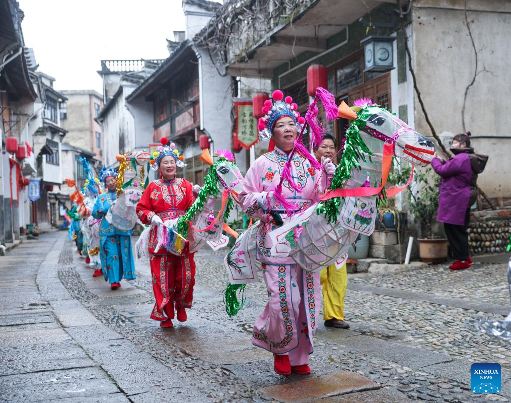 Folk artists perform in celebration of the upcoming Lantern Festival in Heqiao Town, Lin'an District of Hangzhou, east China's Zhejiang Province, Feb. 23, 2024. Several teams of folk art participated in the Lantern Festival celebrations in Heqiao Town on Friday. Heqiao is a famous town with a history of more than 1,000 years in western Zhejiang Province. The Lantern Festival falls on the 15th day of the first lunar month, or Feb. 24 this year. (Xinhua/Xu Yu)