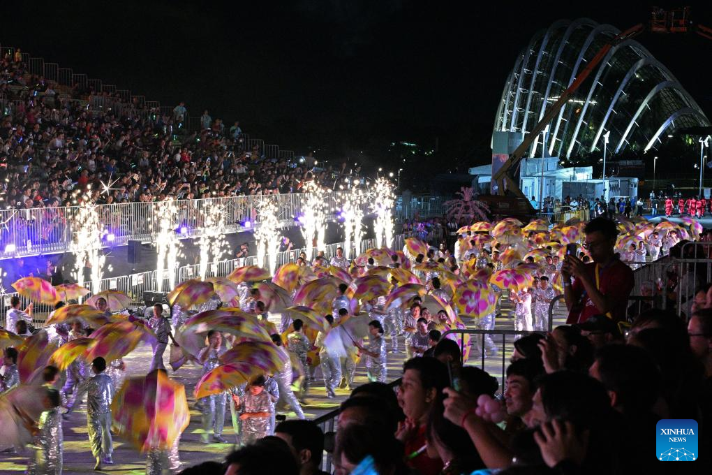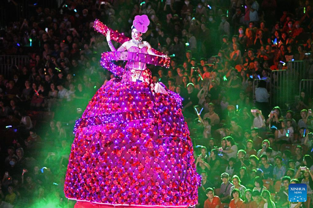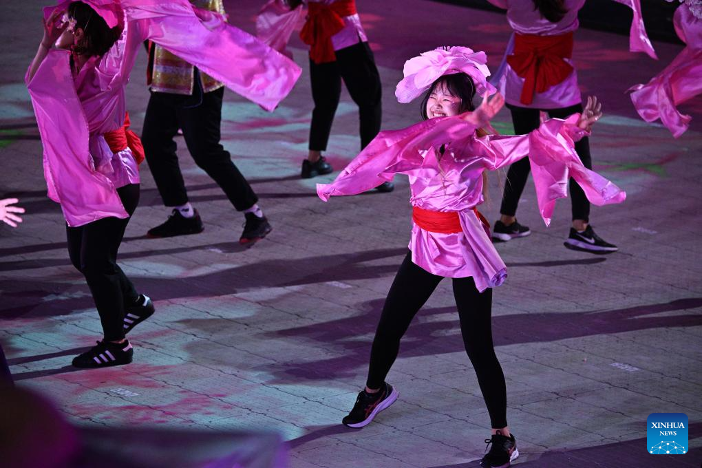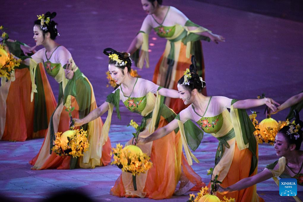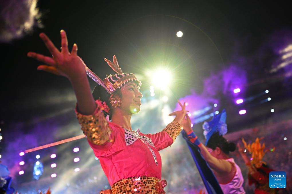 Performers dance during the Chingay Parade as part of the Lunar New Year celebrations in Singapore's F1 Pit Building on Feb. 23, 2024. (Photo by Then Chih Wey/Xinhua)