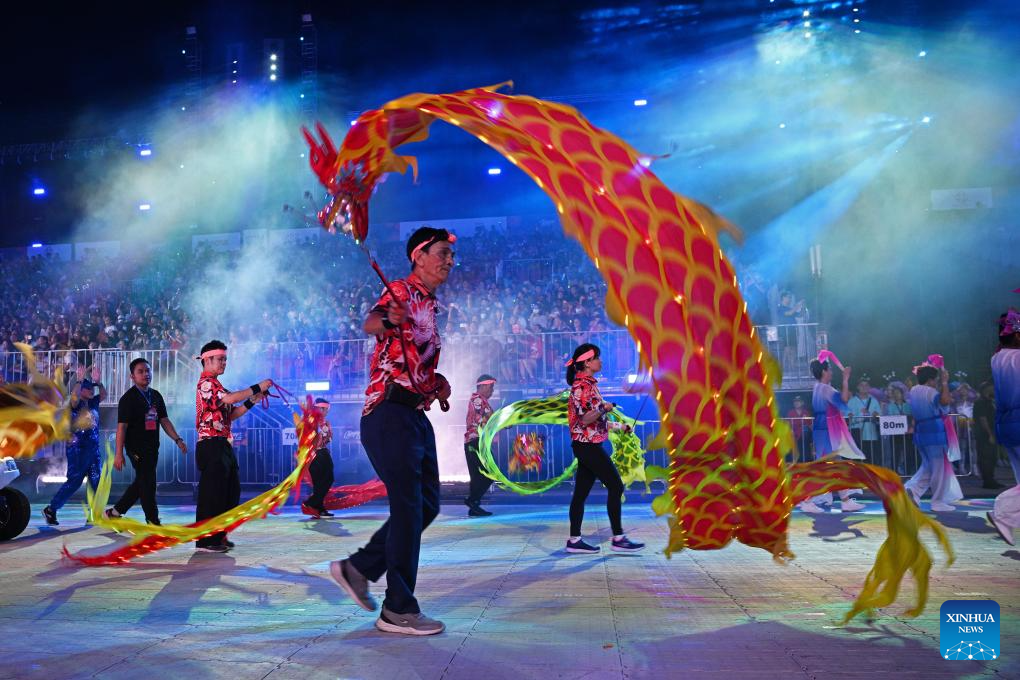 Performers perform dragon dance during the Chingay Parade as part of the Lunar New Year celebrations in Singapore's F1 Pit Building on Feb. 23, 2024. (Photo by Then Chih Wey/Xinhua)