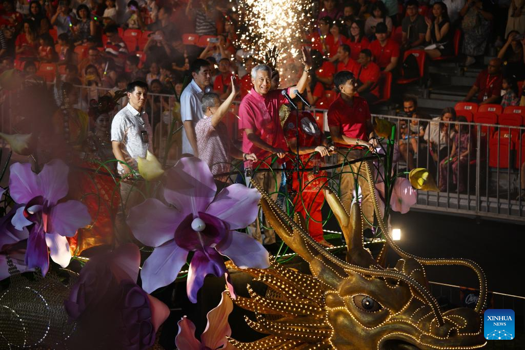 Singaporean Prime Minister Lee Hsien Loong (C) attends the Chingay Parade as part of the Lunar New Year celebrations in Singapore's F1 Pit Building on Feb. 23, 2024. (Photo by Then Chih Wey/Xinhua)