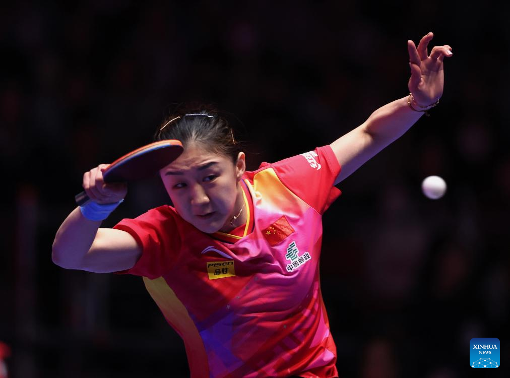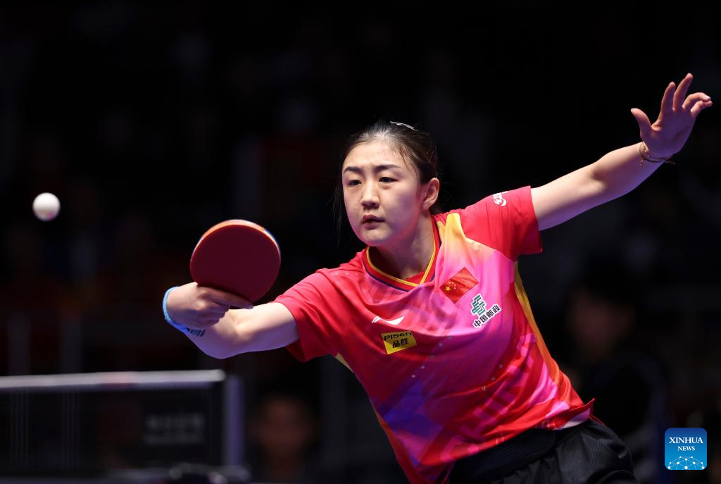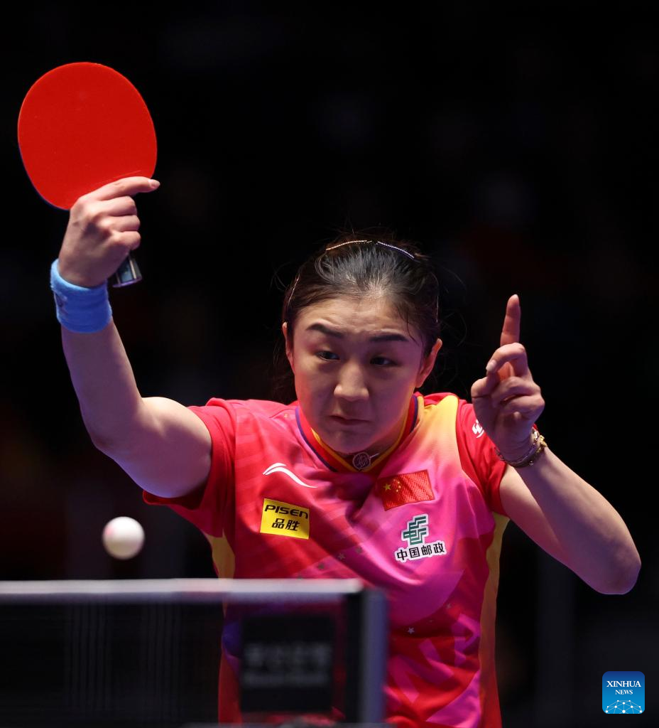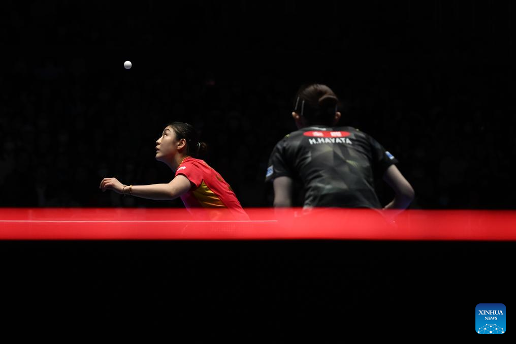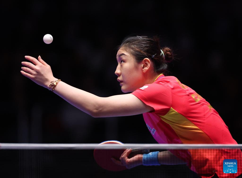 Chen Meng of China hits a return to Hayata Hina of Japan during the women's team final match between China and Japan at the ITTF World Team Table Tennis Championships Finals Busan 2024 in Busan, South Korea, Feb. 24, 2024. (Xinhua/Yang Shiyao)