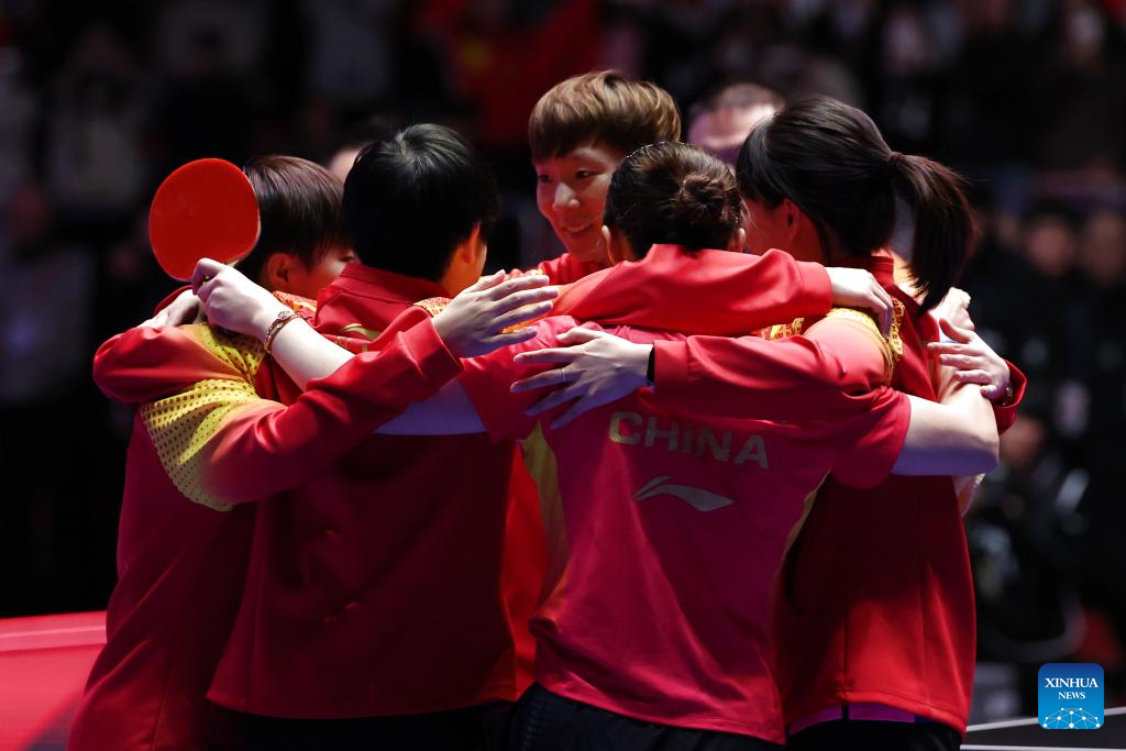 Team China celebrate after winning the women's team final match between China and Japan at the ITTF World Team Table Tennis Championships Finals Busan 2024 in Busan, South Korea, Feb. 24, 2024. (Xinhua/Yao Qilin)