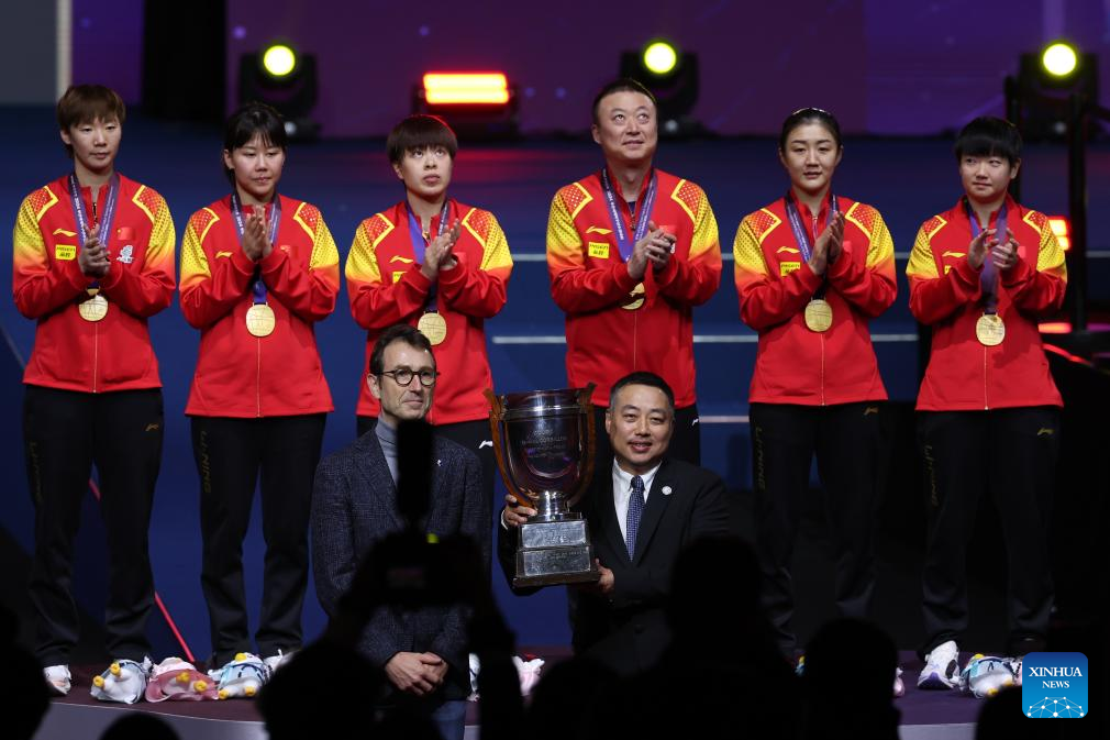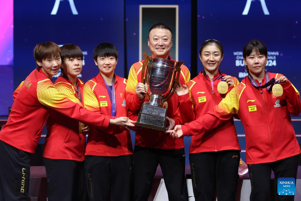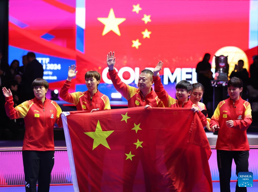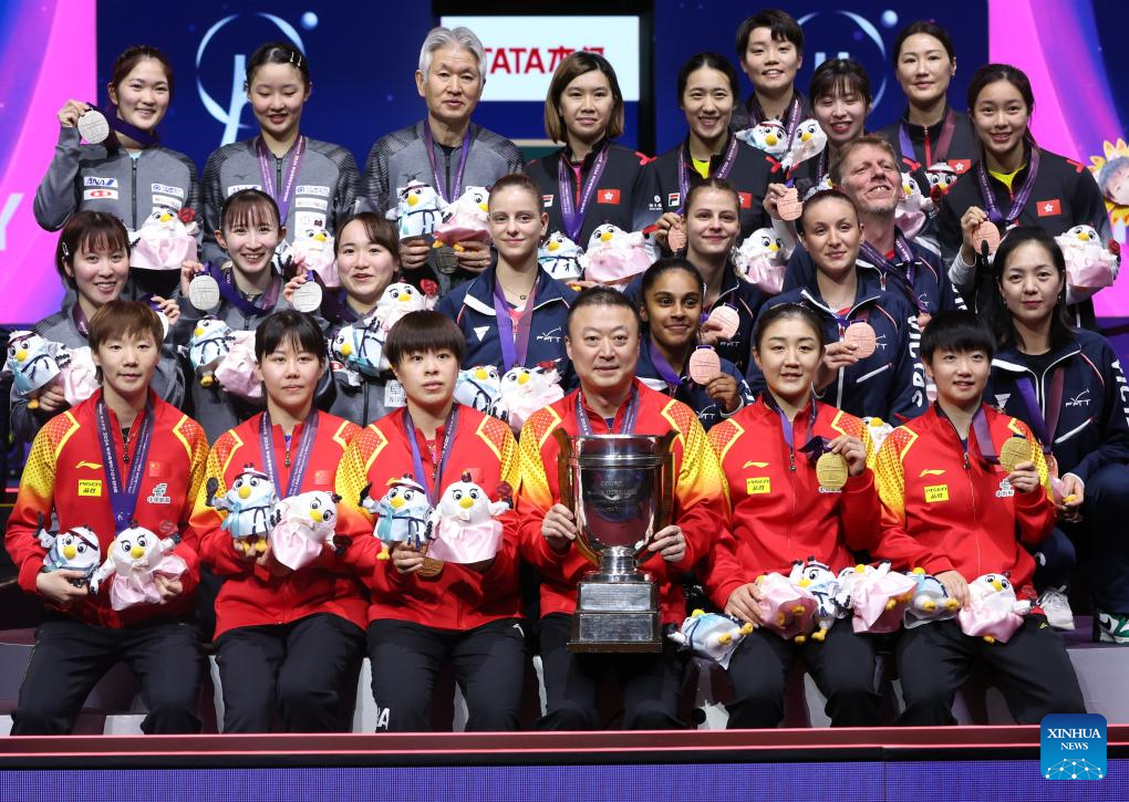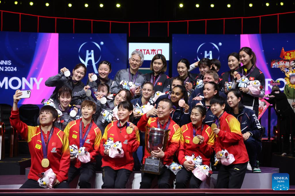 Team China celebrate in the awarding ceremony for the women's team at the ITTF World Team Table Tennis Championships Finals Busan 2024 in Busan, South Korea, Feb. 24, 2024. (Xinhua/Zhang Tao)