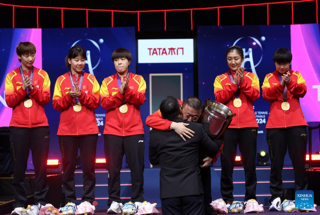 ITTF deputy president Liu Guoliang (4th R) hugs with team China's coach Ma Lin (3rd R) during the awarding ceremony for the women's team at the ITTF World Team Table Tennis Championships Finals Busan 2024 in Busan, South Korea, Feb. 24, 2024. (Xinhua/Yao Qilin)