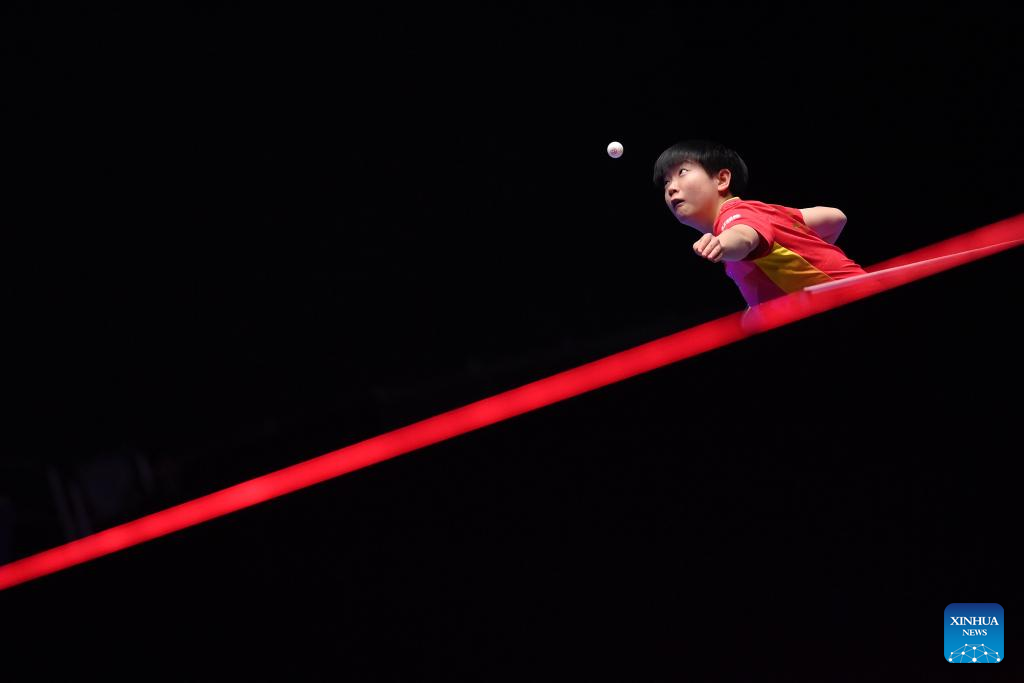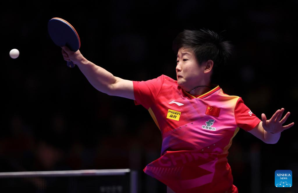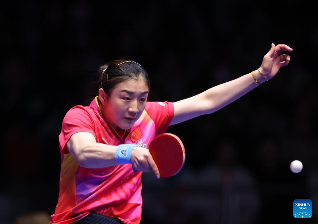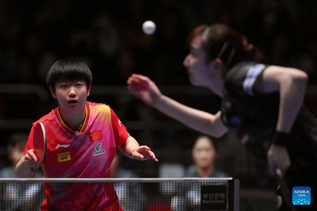 Sun Yingsha of China hits a return to Hayata Hina of Japan during the women's team final match between China and Japan at the ITTF World Team Table Tennis Championships Finals Busan 2024 in Busan, South Korea, Feb. 24, 2024. (Xinhua/Yao Qilin)