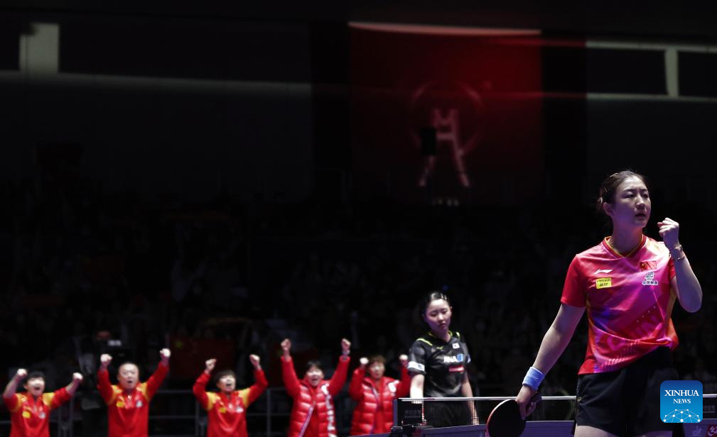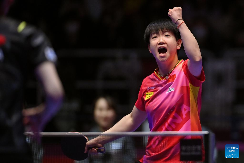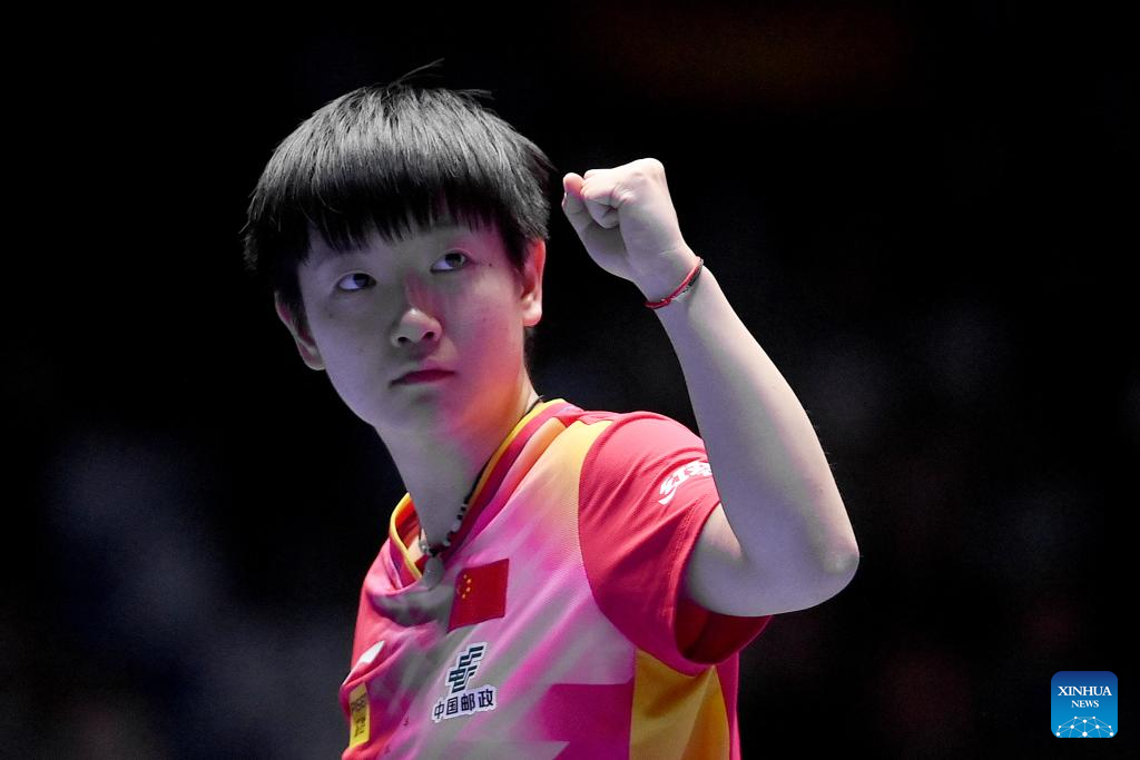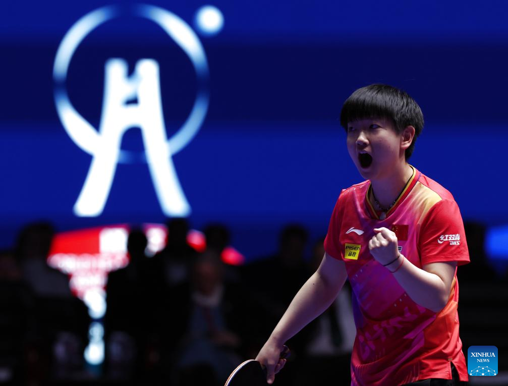 Sun Yingsha of China celebrates scoring in the match against Hayata Hina of Japan during the women's team final match between China and Japan at the ITTF World Team Table Tennis Championships Finals Busan 2024 in Busan, South Korea, Feb. 24, 2024. (Xinhua/Zhang Tao)