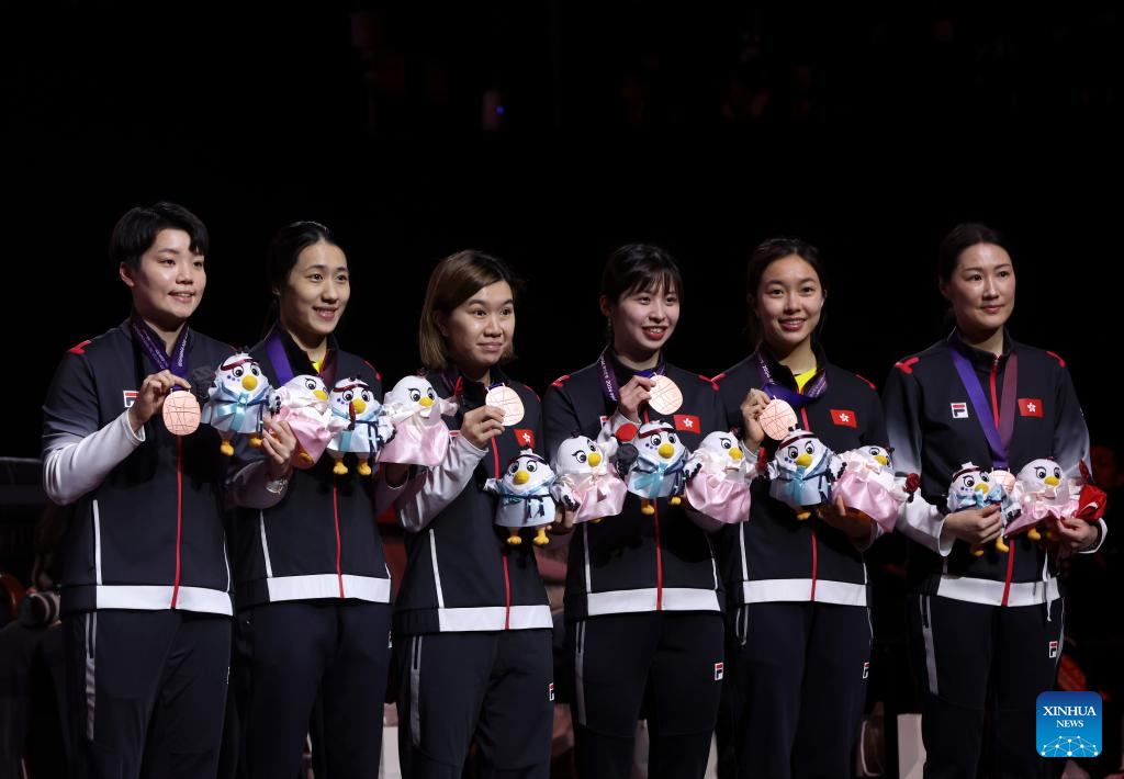Bronze medalists team China's Hong Kong pose for photograph during the awarding ceremony for the women's team at the ITTF World Team Table Tennis Championships Finals Busan 2024 in Busan, South Korea, Feb. 24, 2024. (Xinhua/Yao Qilin)