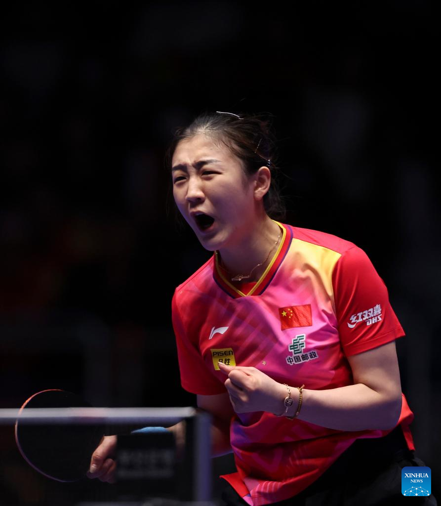 Chen Meng of China celebrates after winning the match against Harimoto Miwa of Japan during the women's team final match between China and Japan at the ITTF World Team Table Tennis Championships Finals Busan 2024 in Busan, South Korea, Feb. 24, 2024. (Xinhua/Zhang Tao)