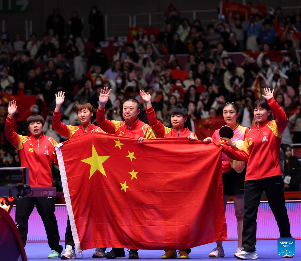 Team China celebrate winning the women's team final match between China and Japan at the ITTF World Team Table Tennis Championships Finals Busan 2024 in Busan, South Korea, Feb. 24, 2024. (Xinhua/Zhang Tao)