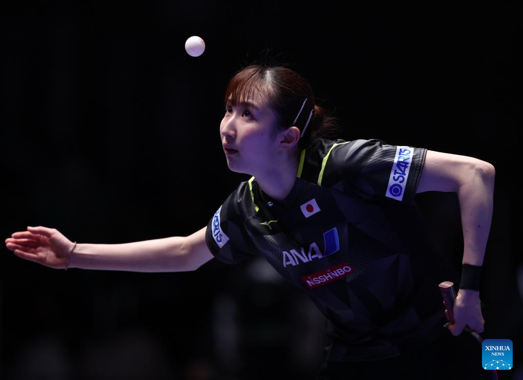 Hayata Hina of Japan serves to Chen Meng of China during the women's team final match between China and Japan at the ITTF World Team Table Tennis Championships Finals Busan 2024 in Busan, South Korea, Feb. 24, 2024. (Xinhua/Yang Shiyao)
