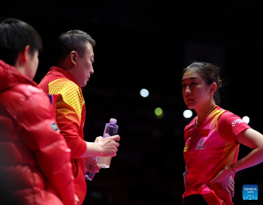 Chen Meng (R) of China listens to coach Ma Lin in the match against Harimoto Miwa of Japan during the women's team final match between China and Japan at the ITTF World Team Table Tennis Championships Finals Busan 2024 in Busan, South Korea, Feb. 24, 2024. (Xinhua/Yao Qilin)