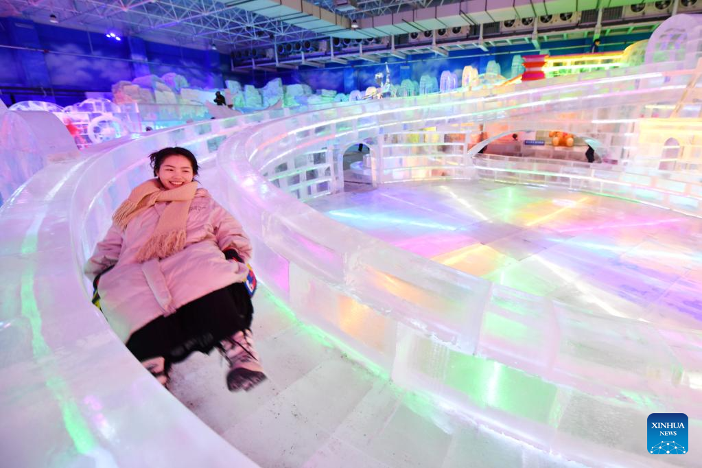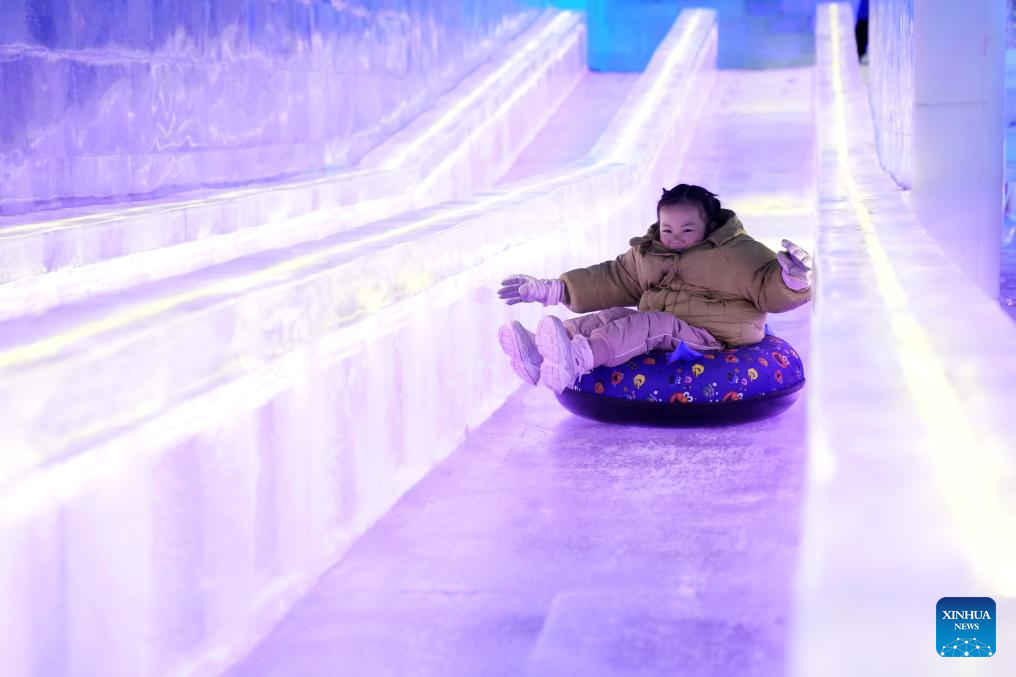 A kid enjoys an ice slide at an ice and snow art gallery of the Sun Island scenic spot in Harbin, northeast China's Heilongjiang Province, Feb. 23, 2024. Covering an area of nearly 5,000 square meters, this indoor ice and snow art gallery wowed tourists with ice sculptures and various ice and snow entertainment. (Xinhua/Wang Jianwei)