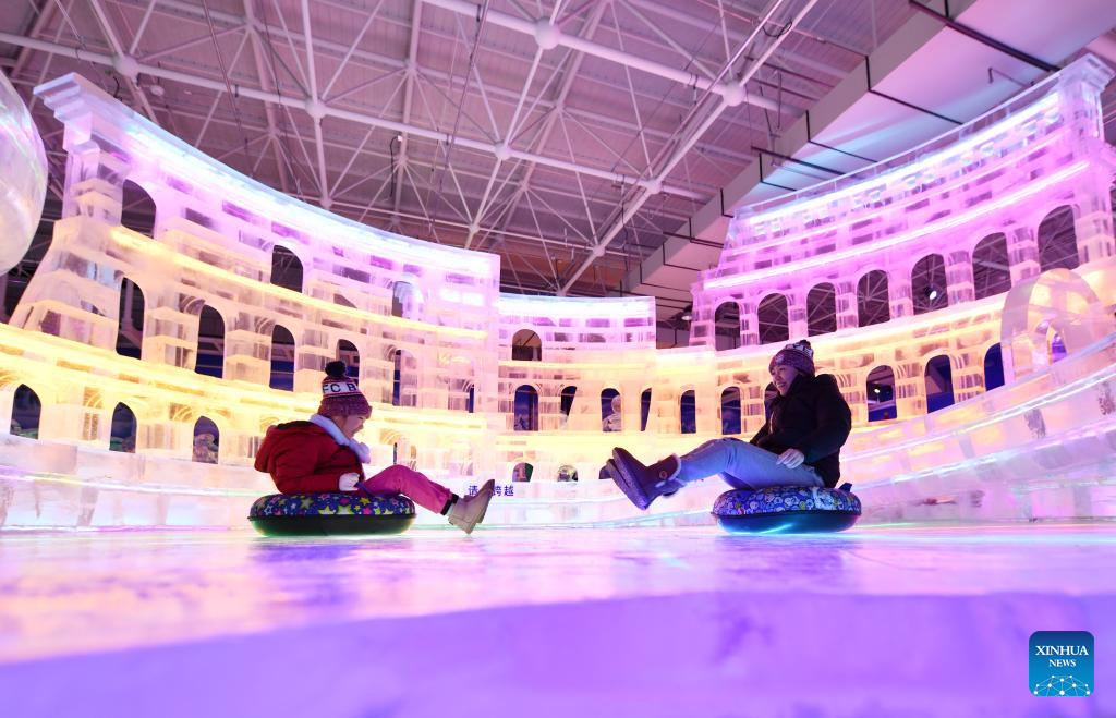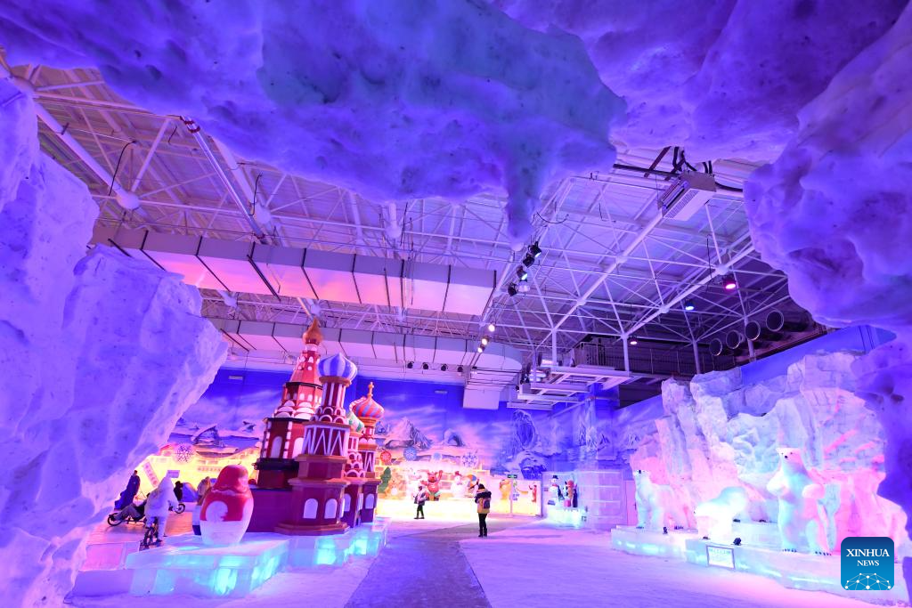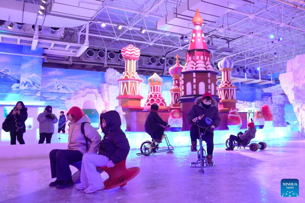 Tourists have fun at an ice and snow art gallery of the Sun Island scenic spot in Harbin, northeast China's Heilongjiang Province, Feb. 23, 2024. Covering an area of nearly 5,000 square meters, this indoor ice and snow art gallery wowed tourists with ice sculptures and various ice and snow entertainment. (Xinhua/Wang Jianwei)