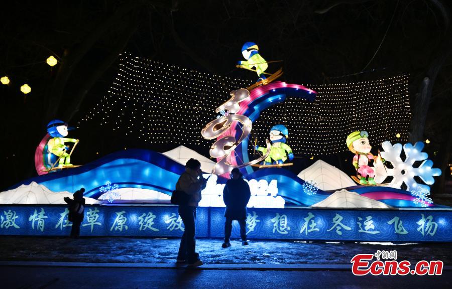Lanterns themed on the 14th National Winter Games are illuminated in Zhalantun City, a host city of the games, north China's Inner Mongolia Autonomous Region, Feb. 25, 2024. (Photo: China News Service/Liu Huawen)