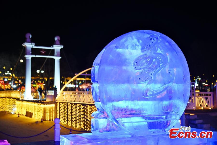 An ice sculpture themed on the 14th National Winter Games is illuminated in Zhalantun City, a host city of the games, north China's Inner Mongolia Autonomous Region, Feb. 25, 2024. (Photo: China News Service/Liu Huawen)
