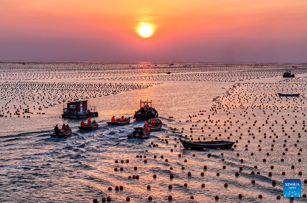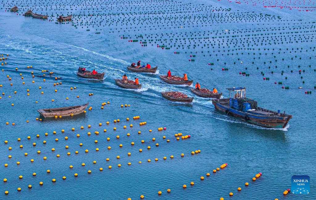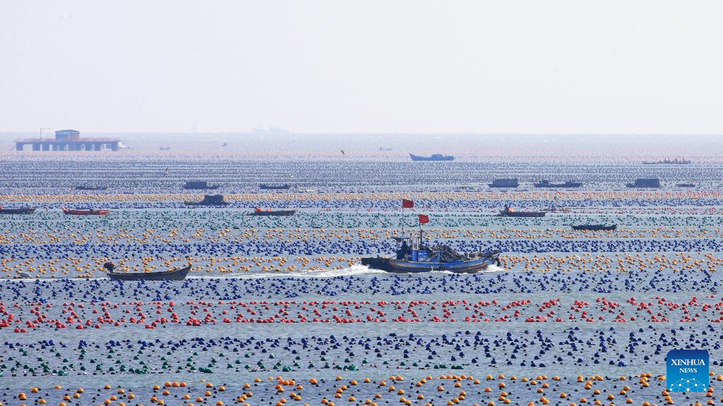 This photo taken on Feb. 26, 2024 shows fishermen working at a marine ranch in Ailun Bay of Rongcheng City, east China's Shandong Province. (Photo by Wang Fudong/Xinhua)