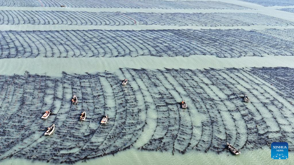 An aerial drone photo taken on Feb. 26, 2024 shows fishermen working at a marine ranch in Lidao Bay of Rongcheng City, east China's Shandong Province. (Photo by Li Xinjun/Xinhua)