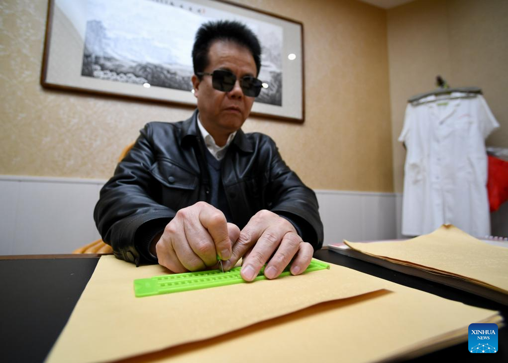 Wang Yongcheng arranges a Braille document on his suggestions at an instruction center of blind massage in Fuzhou, southeast China's Fujian Province, Feb. 6, 2024. (Xinhua/Jiang Kehong)