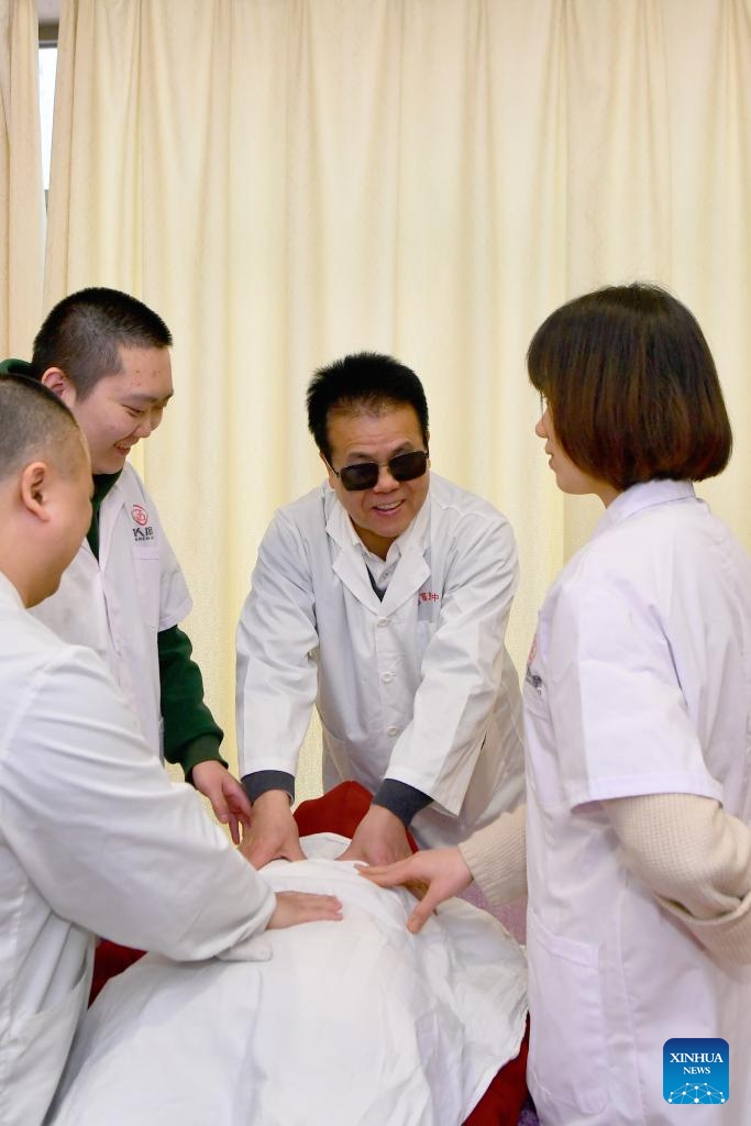 Wang Yongcheng demonstrates massage techniques for people with visual impairment at an instruction center of blind massage in Fuzhou, southeast China's Fujian Province, Feb. 6, 2024.(Xinhua/Jiang Kehong)