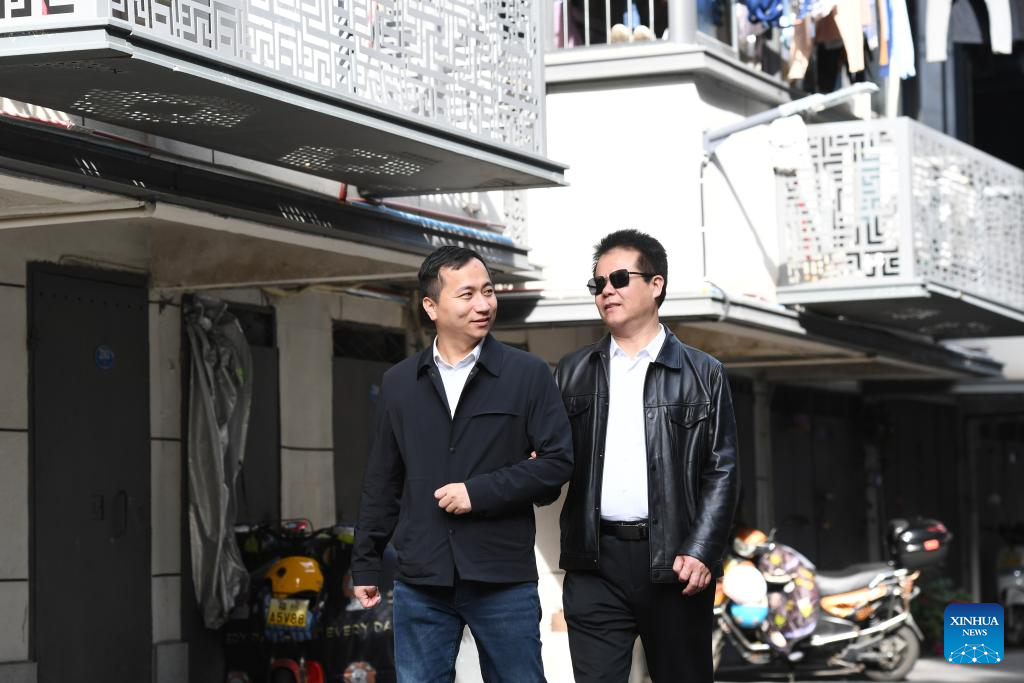 Wang Yongcheng (1st L) learns about the education of children of people with visual impairment and their daily life in an affordable housing community in Fuzhou, southeast China's Fujian Province, Feb. 18, 2024. (Xinhua/Jiang Kehong)