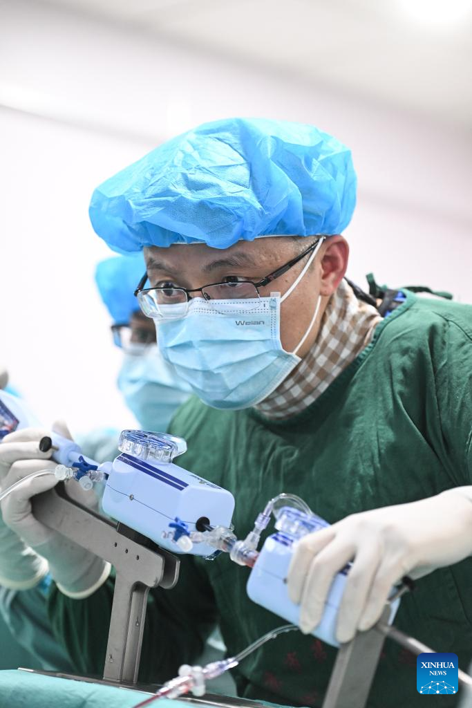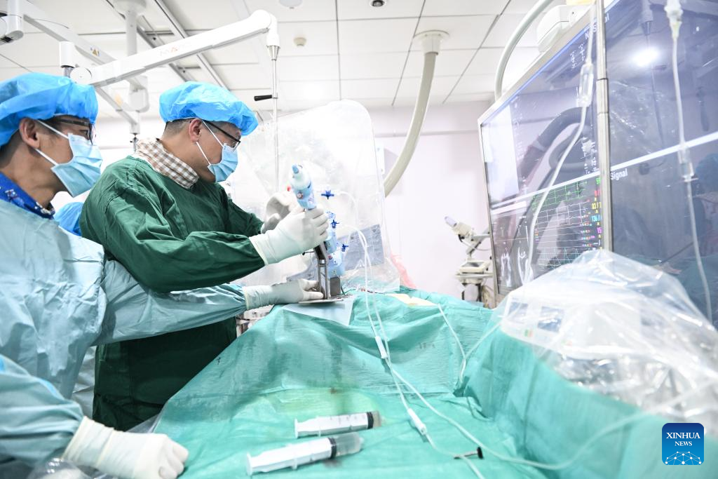 Zhang Junjie (R) and his colleague perform surgery on a patient at the Nanjing First Hospital in Nanjing, east China's Jiangsu Province, Feb. 20, 2024. (Xinhua/Ji Chunpeng)