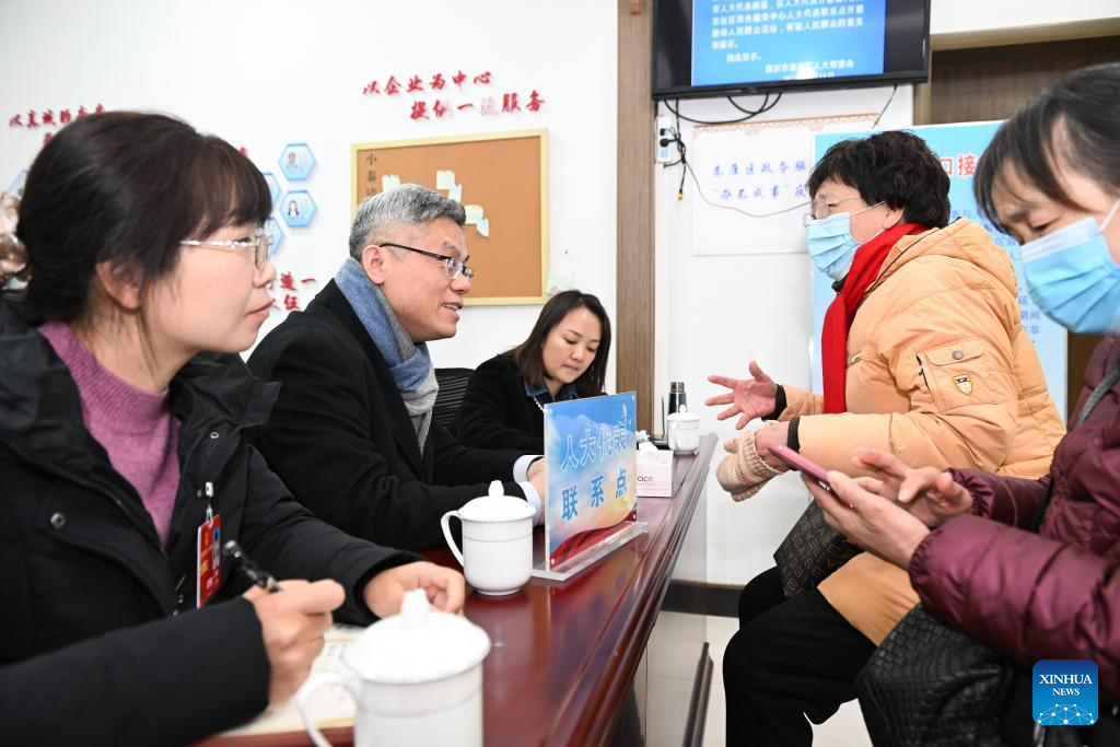 Zhang Junjie (2nd L) communicates with residents at a local legislators' liaison station in Qinhuai District of Nanjing, east China's Jiangsu Province, Feb. 22, 2024. (Xinhua/Ji Chunpeng)