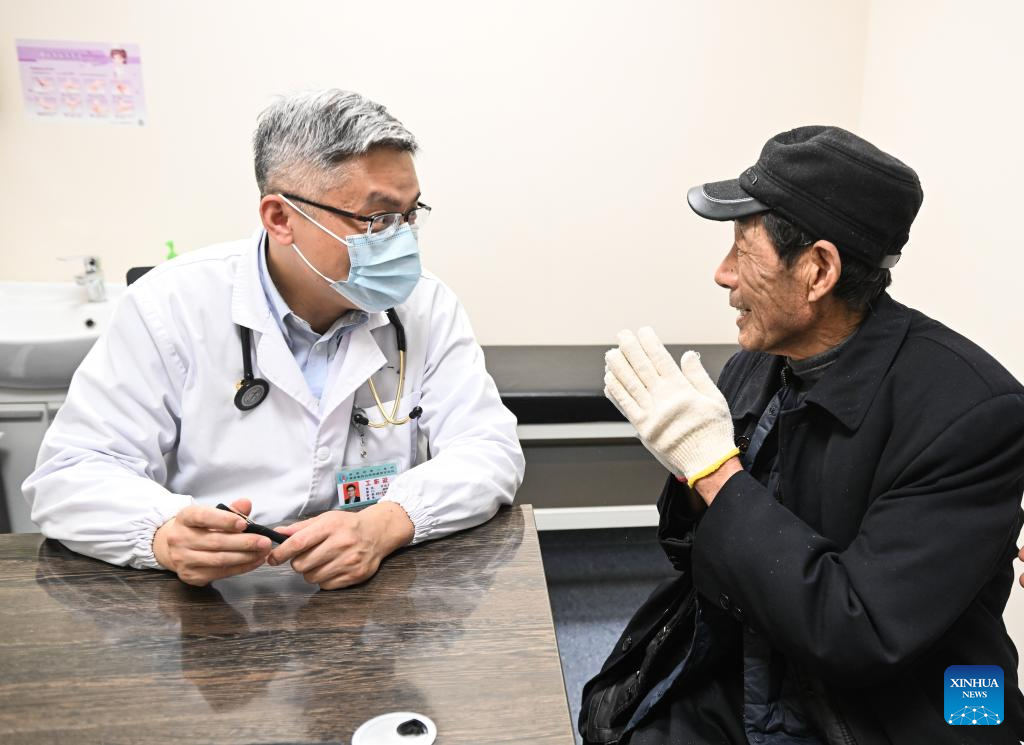 Zhang Junjie (R) communicates with colleagues at the Nanjing First Hospital in Nanjing, east China's Jiangsu Province, Feb. 20, 2024. (Xinhua/Ji Chunpeng)
