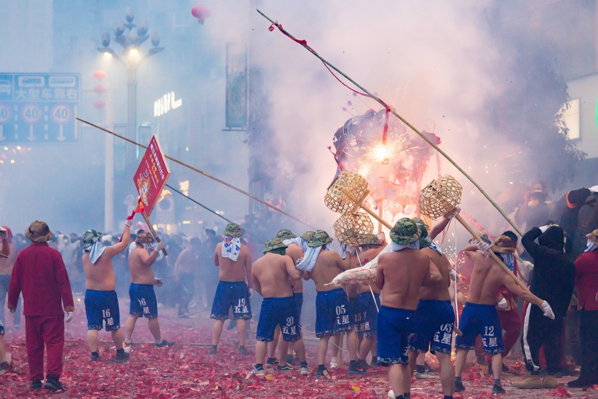 A time-honored tradition of the local Tujia ethnic group, the celebration takes place every year during the Lantern Festival. During the event, dragon dance teams brave the streets while spectators hurl firecrackers and fireworks at them. This exhilarating event creates a lively spectacle, earning the event its nickname, "Oriental Carnival." In 2021, this unique tradition was added to the expanded list of state-level intangible cultural heritage items.