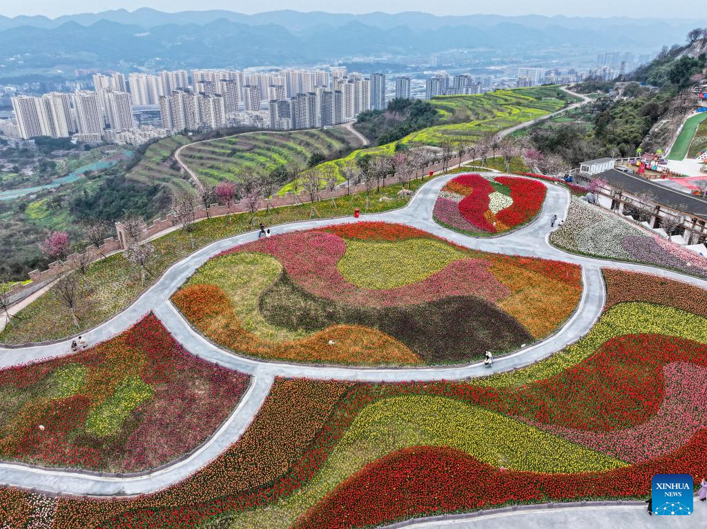 An aerial drone photo taken on Feb. 27, 2024 shows blooming tulips at a scenic area in southwest China's Chongqing. (Xinhua/Tang Yi)