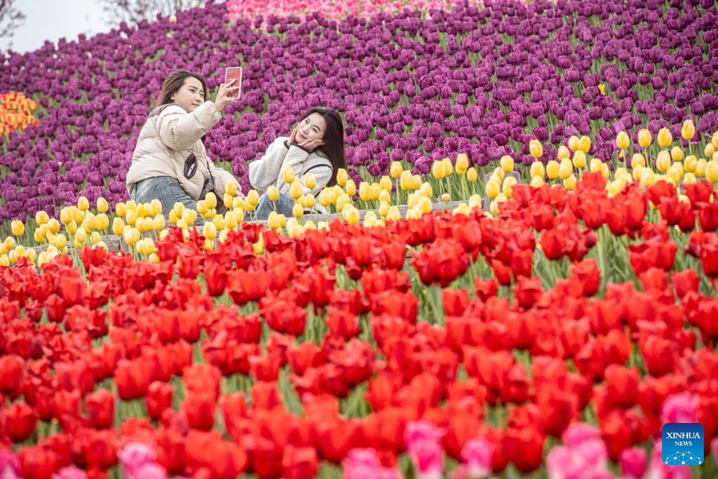 Visitors take photos of blooming tulips at a scenic area in southwest China's Chongqing, Feb. 27, 2024. (Xinhua/Tang Yi)