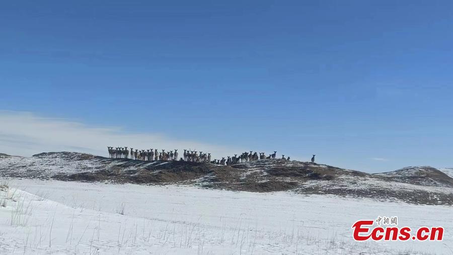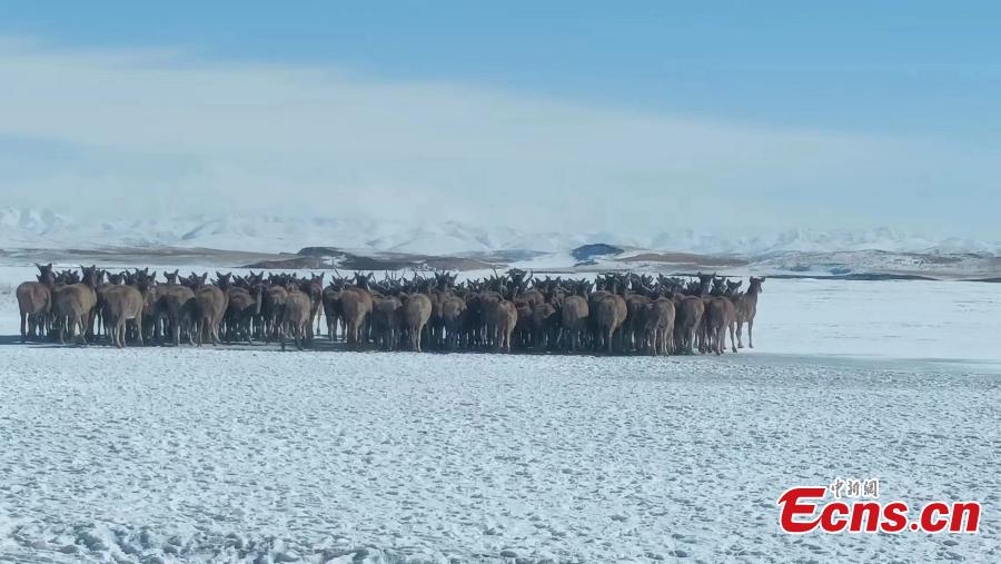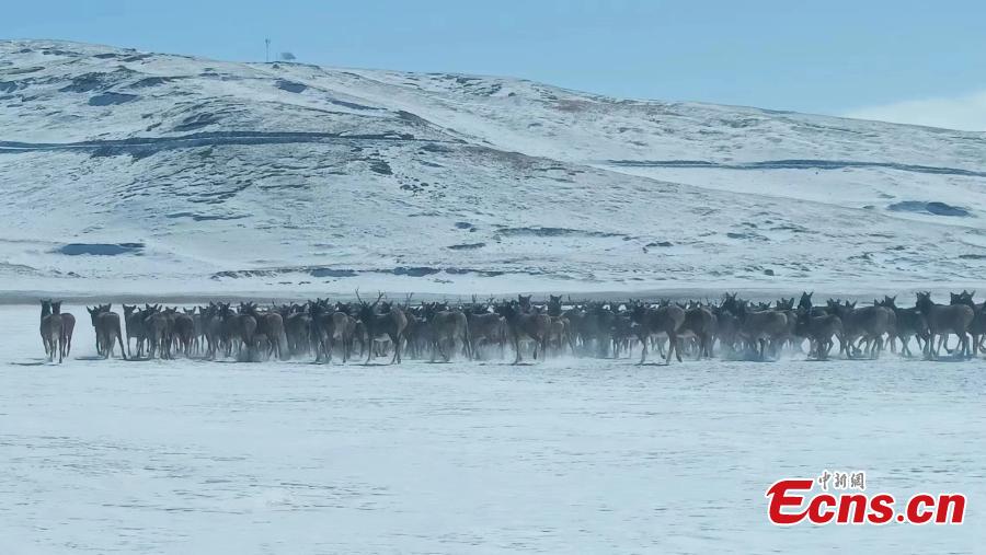 A herd of over 100 white-lipped deer, under China's first-class national protection, migrate on the frozen Yellow River in Sanjiangyuan National Park in northwest China's Qinghai Province. (Photo/China News Service)
