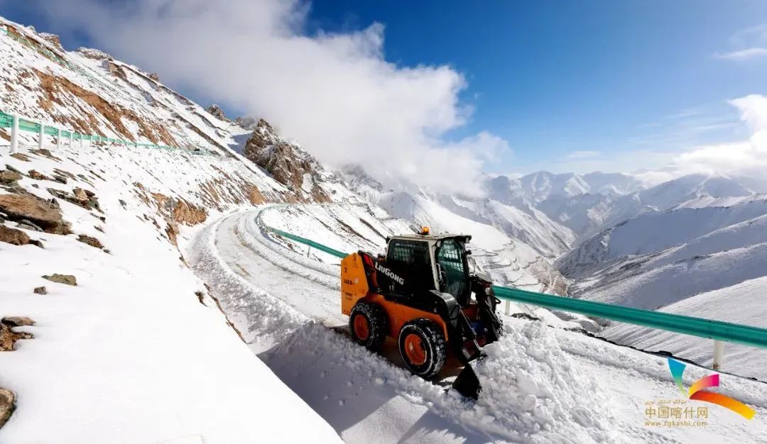 A skid-steer loader clears snow on a mountain road in Xihexiu township, Yecheng county, northwest China's Xinjiang Uygur Autonomous Region. (Media convergence center of Yecheng county/Ma Jiabing)