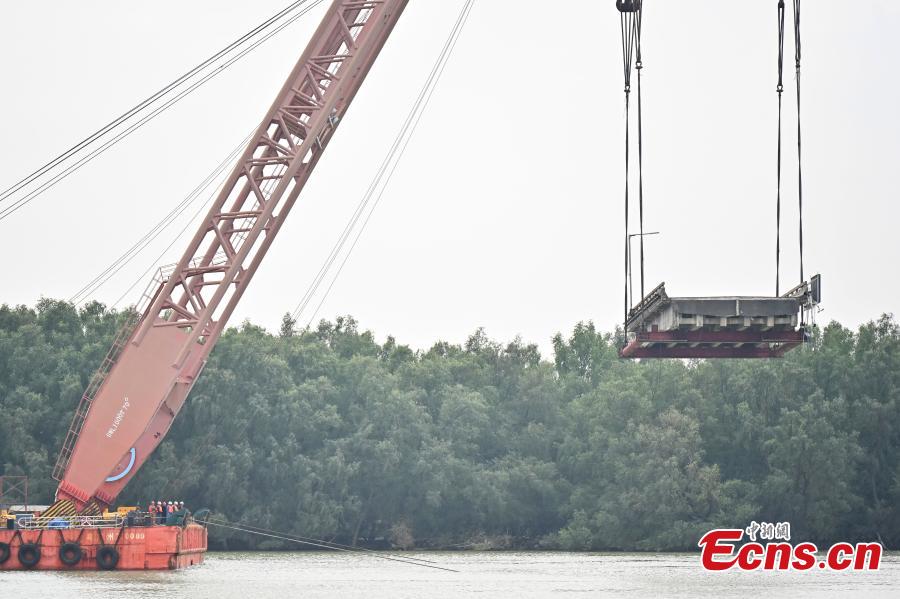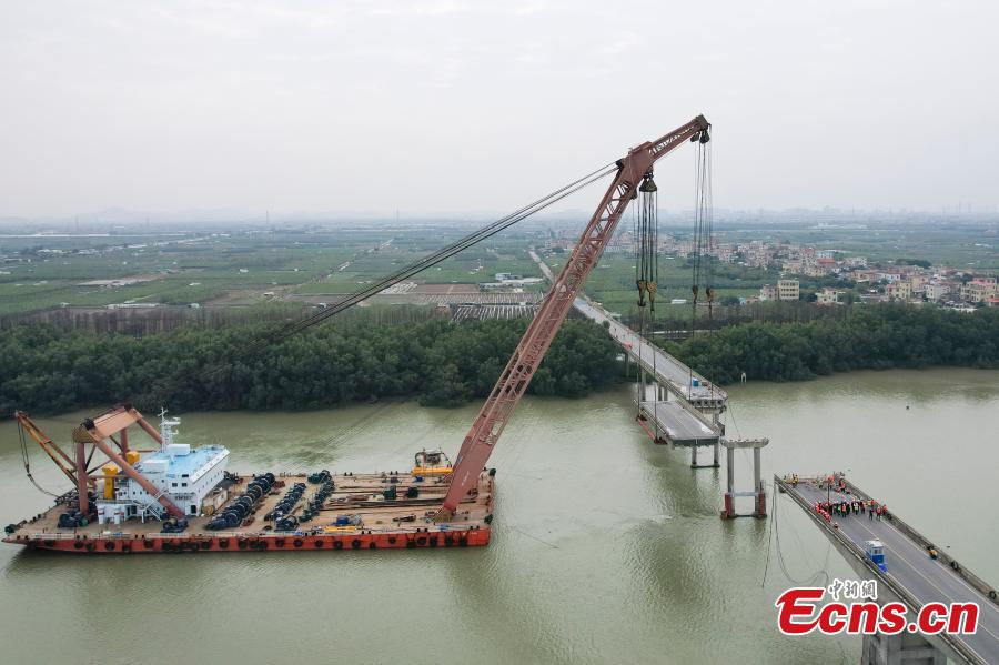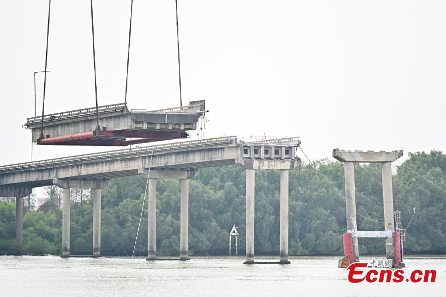 Demolition work is underway at the collision site of Lixinsha Bridge in Nansha District of Guangzhou, south China's Guangdong Province, Feb. 27, 2024. (Photo: China News Service/Chen Jimin)