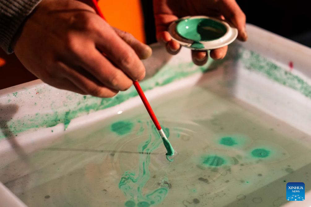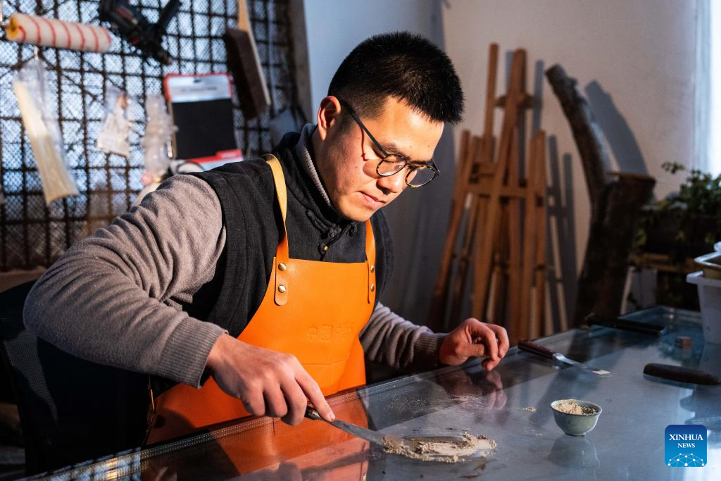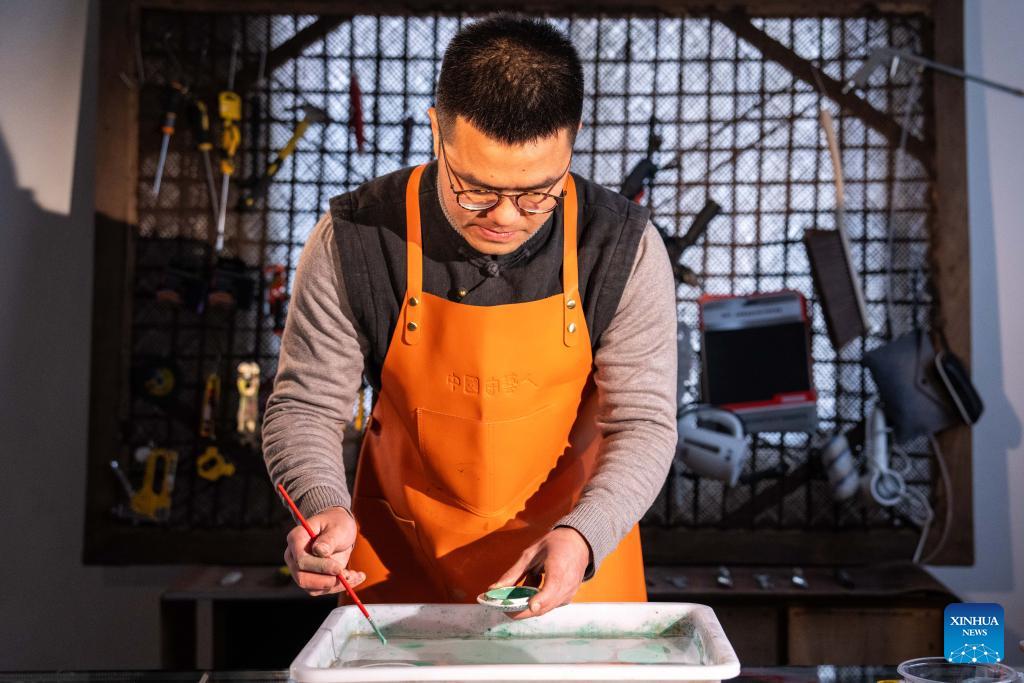 Hao Guanxiong makes an artwork at his studio in Changsha, central China's Hunan Province, Feb. 28. 2024. (Xinhua/Chen Sihan)