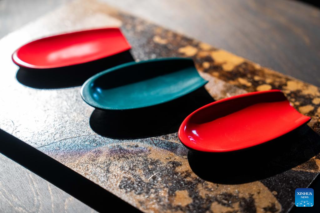 A lacquer coated plate is displayed at Hao Guanxiong's studio in Changsha, central China's Hunan Province, Feb. 28. 2024. (Xinhua/Chen Sihan)