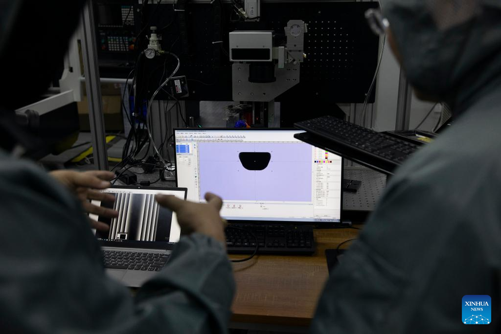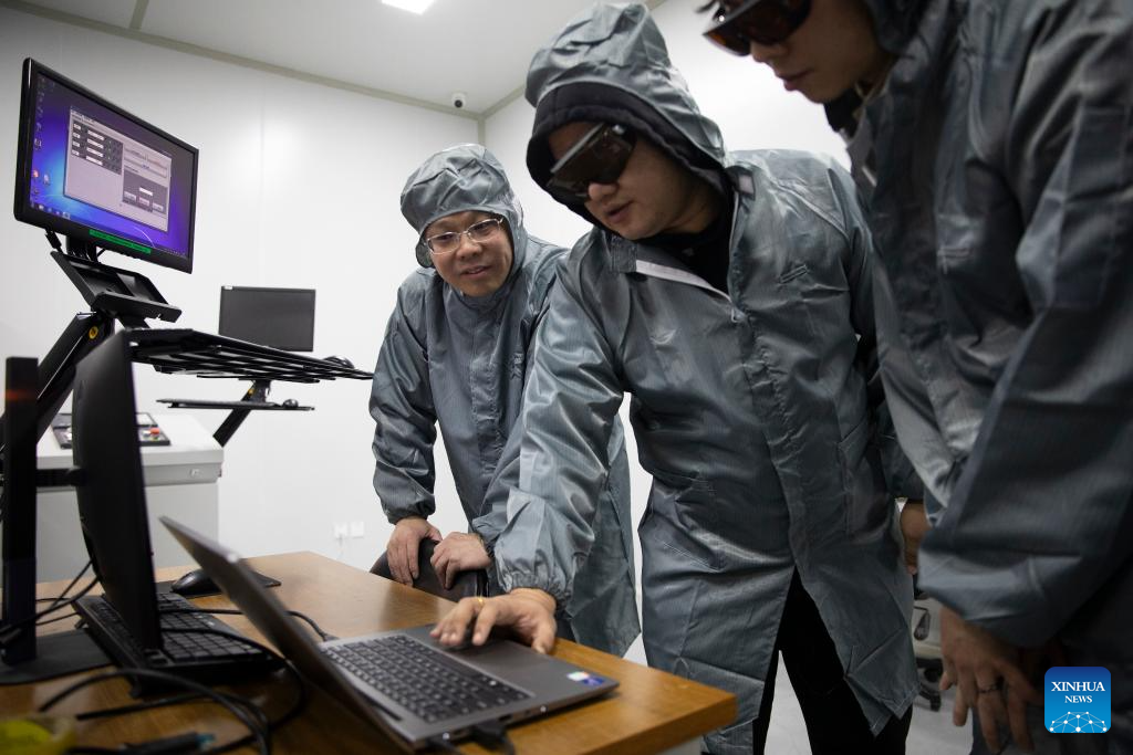 Yang Xiaojun (L) discusses research progress with colleagues at a laboratory of MICROMACH in Xi'an, northwest China's Shaanxi Province, Jan. 17, 2024. (Xinhua/Jin Liwang)