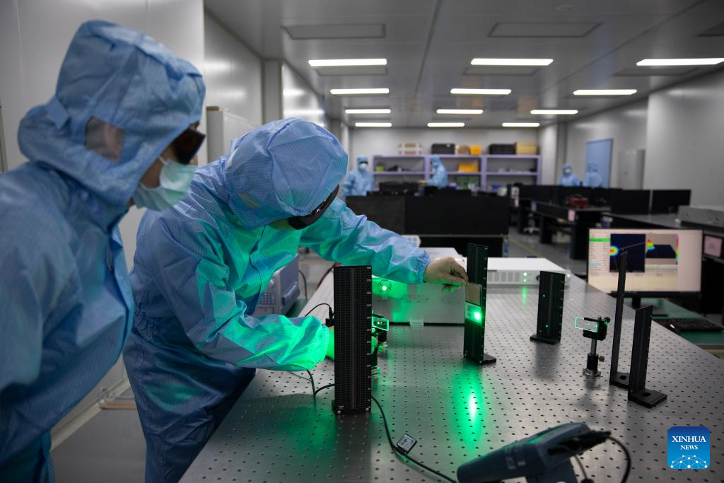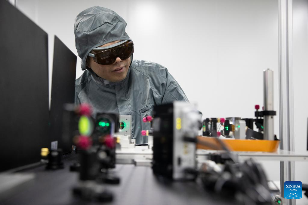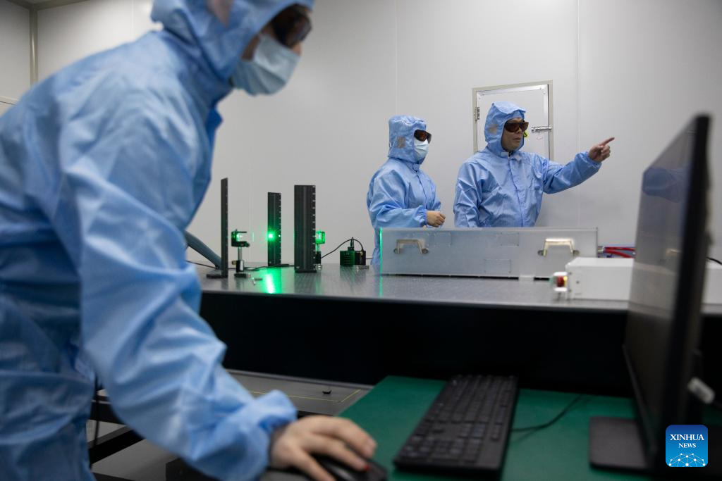 Yang Xiaojun (R) adjusts experimental equipment at a laboratory of MICROMACH in Xi'an, northwest China's Shaanxi Province, Jan. 17, 2024. (Xinhua/Jin Liwang)