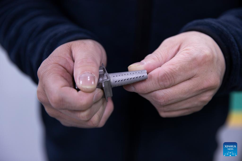 Yang Xiaojun shows a new type of turbine blade processed at a workshop of MICROMACH in Xi'an, northwest China's Shaanxi Province, Jan. 19, 2024. (Xinhua/Jin Liwang)