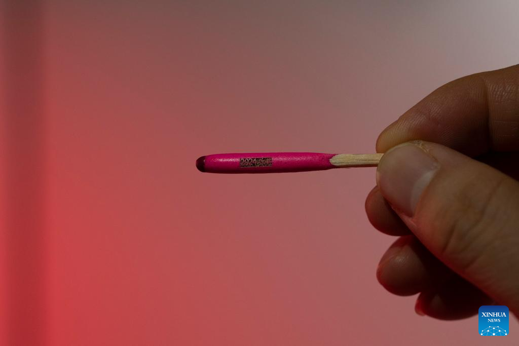 A worker shows the words engraved on a match head with ultra-fast laser micromachining technology at a workshop of MICROMACH in Xi'an, northwest China's Shaanxi Province, Jan. 19, 2024. (Xinhua/Jin Liwang)