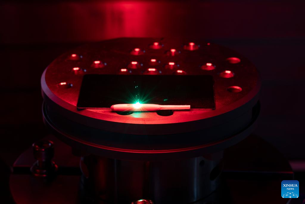 An ultra-fast laser micro-machining device engraves characters on a match head at a workshop of MICROMACH in Xi'an, northwest China's Shaanxi Province, Jan. 19, 2024. (Xinhua/Jin Liwang)