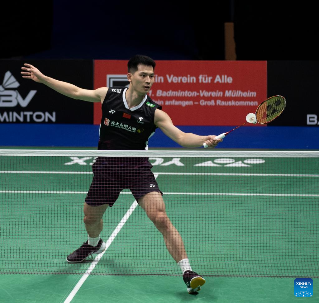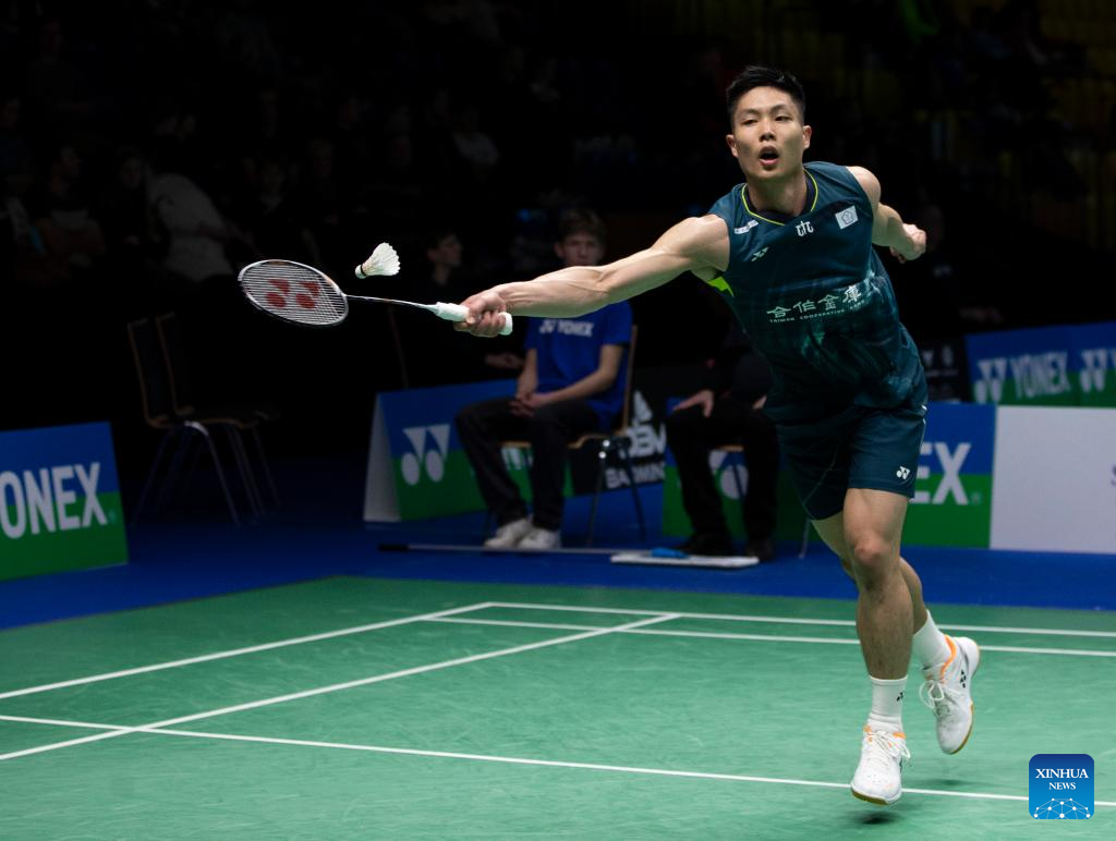 Chou Tien Chen of Chinese Taipei returns the shuttlecock to Zhao Junpeng of China during the men's singles second round match at Yonex German Open 2024 badminton tournament in Muelheim, Germany, Feb. 29, 2024. (Xinhua/Zhang Fan)
